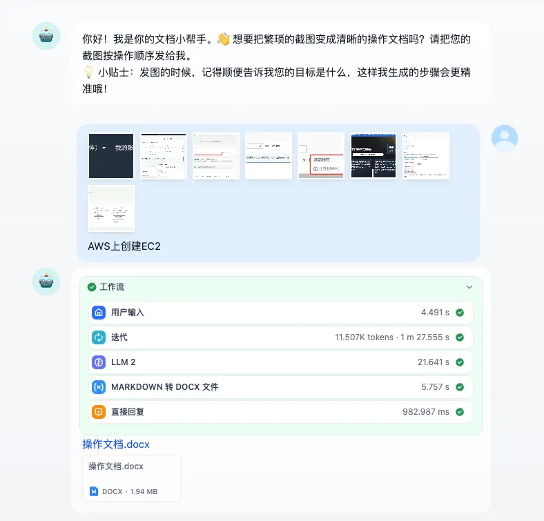 POC 验收阶段,客户通常要求提供《系统部署指南》或《用户操作手册》。传统做法是:一边操作系统,一边截图,再粘贴到 Word 中逐条标注“点击此处”“填写参数”……这不仅枯燥,还易出错,尤其当流程步骤多达十几页时。借助大模型的多模态能力,我们构建一个支持批量处理的文档生成工作流: