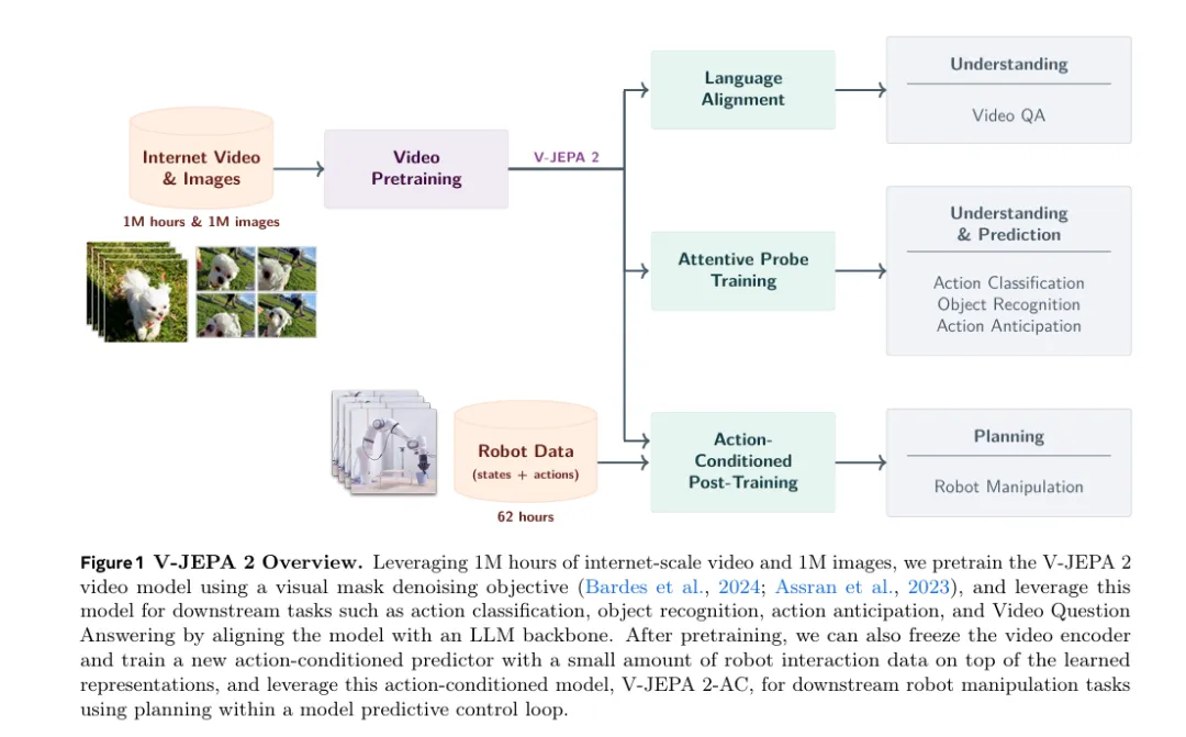 此外,V-JEPA 2⁹(arXiv:2506.09985)实现JEPA的落地突破:基于100万小时互联网视频预训练,在动作理解、预测任务中达到SOTA,更通过少量机器人数据微调,零样本部署到Franka机械臂完成抓取任务,打通“表征学习→机器人规划”的链路。