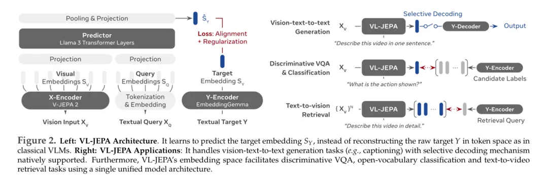 VL-JEPA¹⁰(arXiv:2512.10942)则深耕视觉-语言领域,以50%参数量超越传统VLM,支持选择性解码,兼顾效率与性能。