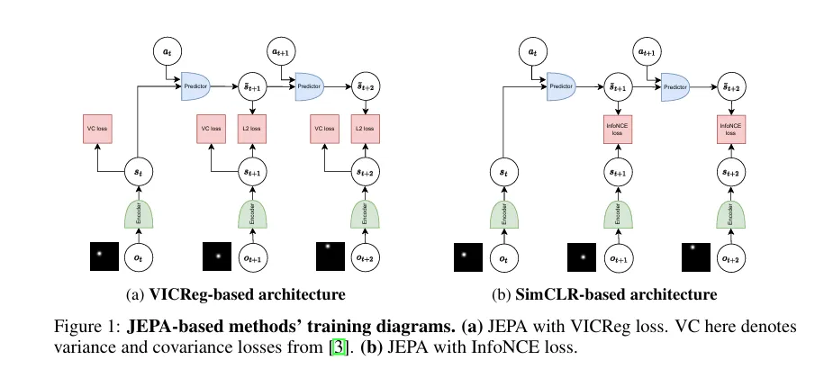 该研究在 “移动点 + 干扰背景” 的简单环境中,聚焦无奖励、全离线场景,对比了搭配 VICReg、SimCLR 目标的 JEPA 与重建式、逆动力学建模等方法的性能。结果显示:当干扰噪声逐帧变化时,JEPA 表现持平甚至优于重建式方法,但在固定噪声下会因聚焦 “慢特征”(静态干扰)而忽略目标 —— 这一发现既验证了 JEPA “重建无关” 设计的可行性,也明确了其早期短板,为后续 HJEPA(层次化 JEPA)等优化方向提供了关键依据。