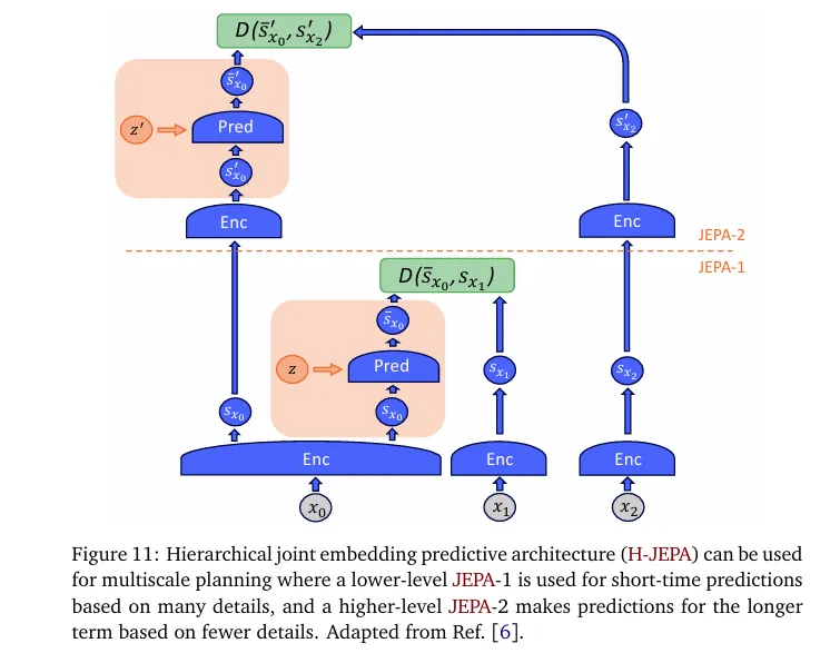年中,LeCun团队发表H-JEPA综述³(arXiv:2306.02572),为JEPA构建了统一理论框架。论文将能量模型、潜变量模型与JEPA结合,提出“分层联合嵌入预测架构”,明确JEPA的核心目标是学习“抽象、可预测、可操控”的世界模型——这篇综述堪称JEPA的“理论纲领”,为后续所有变种(V-JEPA/LLM-JEPA)提供了底层逻辑支撑。