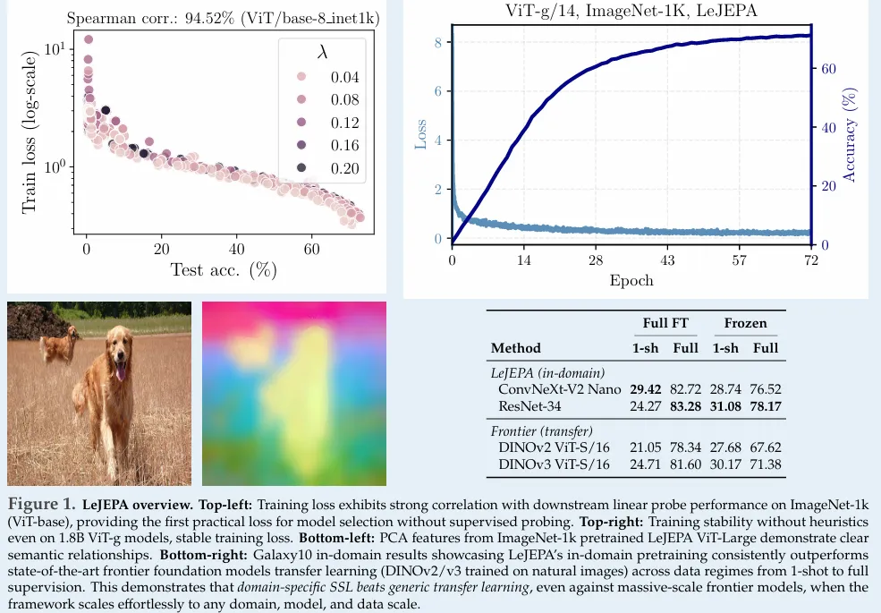 在理论优化上,LeJEPA⁶(arXiv:2511.08544)解决了早期JEPA依赖启发式设计的痛点。它提出“各向同性高斯嵌入”为最优分布,设计轻量的SIGReg正则化,实现“无启发式”JEPA:仅1个超参、线性复杂度、50行代码即可部署,在多种架构、数据集上验证了稳定性,推动JEPA工业化落地。