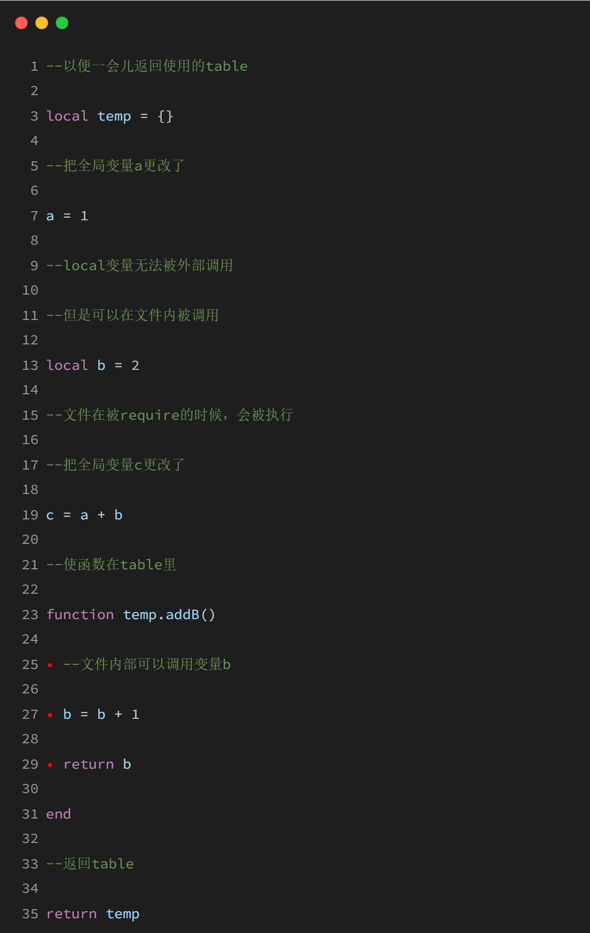 第二种调用方法依旧是在文件开头写上文件名={},不同的是,需要被调用的函数名,可以写成文件名.函数名的形式,最后的return不需要return一个很长的table了,只需要return 文件名,例如: