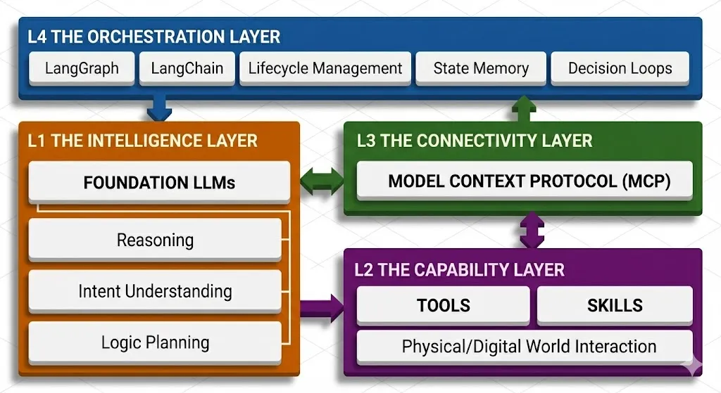 为了系统性地理解当前的工程生态,我们需要将现代AI应用栈解构为四个核心层次。这四个层次恰好对应了用户询问的几个核心概念:Agent、Skills/Tools、MCP、以及LangGraph/LangChain。