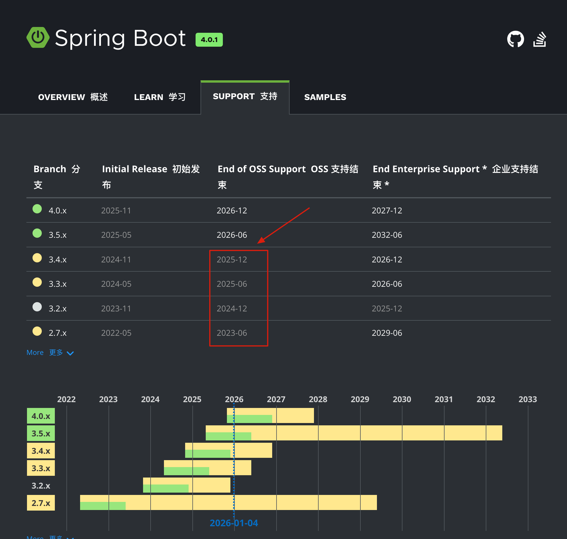 就在前阵子,Spring Boot 4.0 正式发布,3.2.x、3.3.x 和 3.4.x 这些 2024 年发布的版本官方已经不在维护了,也就是不再提供免费的安全更新和错误修复。
