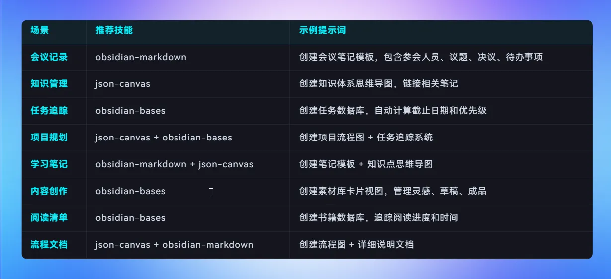 Obsidian Bases 是基于 YAML 的数据视图系统,可以将笔记转换为数据库表格、卡片视图等。AI 可以自动创建配置文件。
