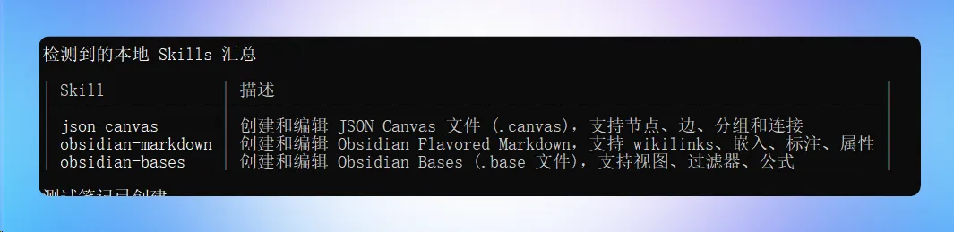 请列出你检测到的本地 skills(json-canvas / obsidian-markdown / obsidian-bases),并在常用工具创建一个测试笔记赵国强.md 包含 [[链接]]、#tag、- [ ] todo。