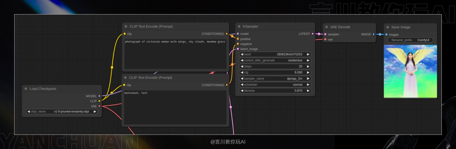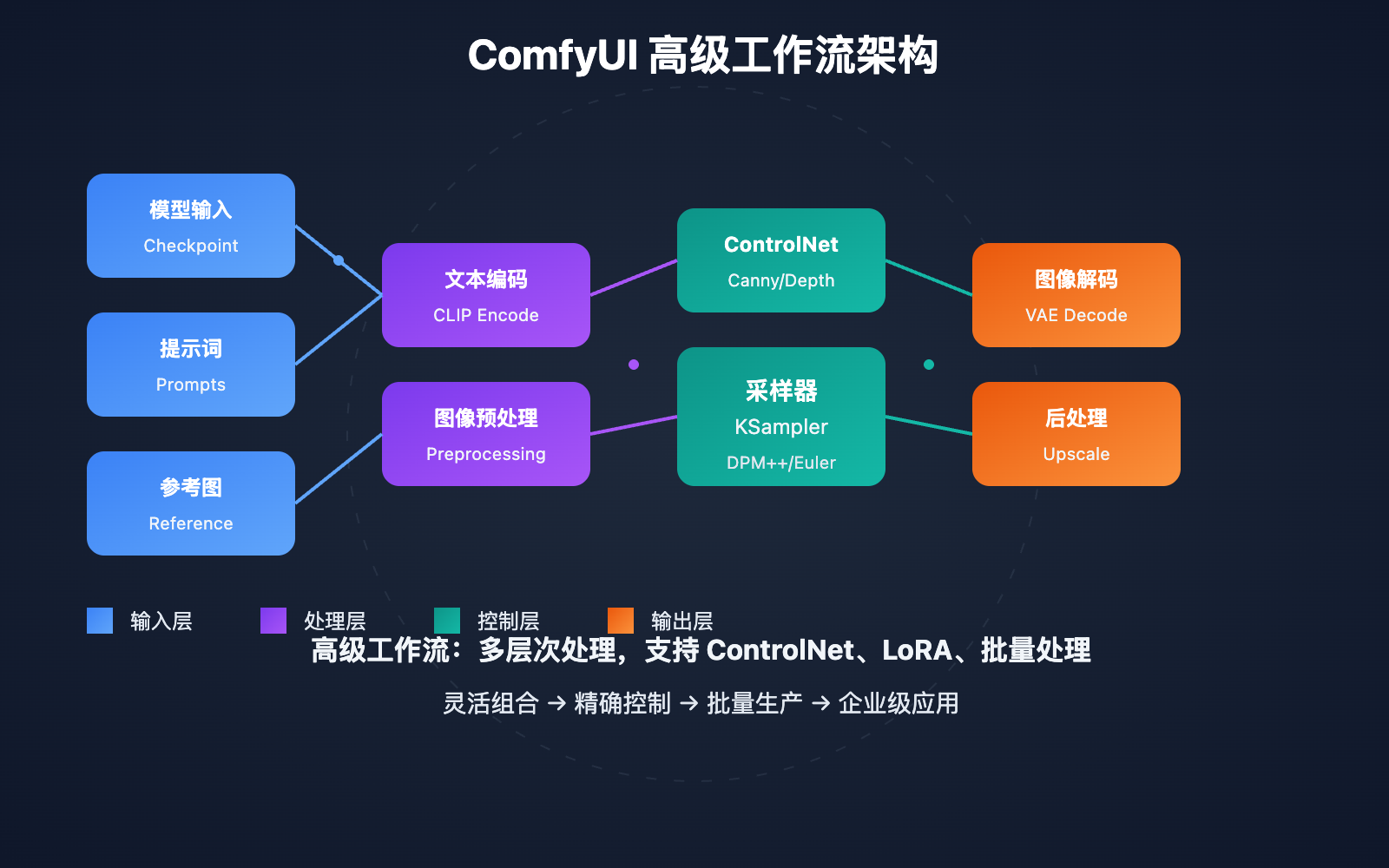 ComfyUI 采用 图形化的工作流 方式,让用户可以像搭积木一样,自由组合各种计算节点。这种方式可以直观地构建复杂的图像生成管道,比如: