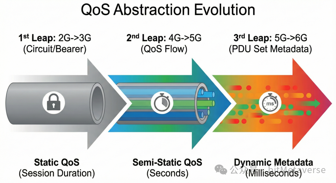 | 第三次 | 5G→6G | Traffic Metadata (PDU Set) | PDU组级 动态元数据 | 以毫秒计 (帧级) | XR 移动AI 触觉互联 | 待标准化 |