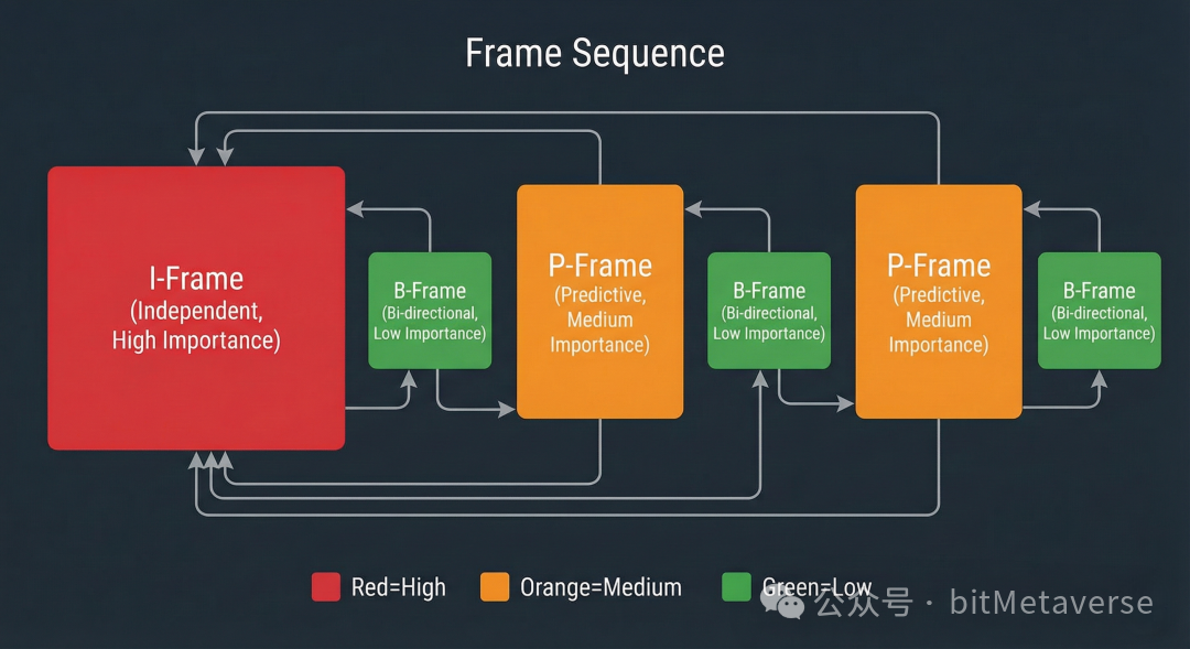 这种分级不是工程师的主观设计,而是源编码的数学必然。为了降低比特率,编码器必须利用帧间的时间相关性——后续帧只传输与参考帧的差异。这种"差异编码"天然导致了两个结果: