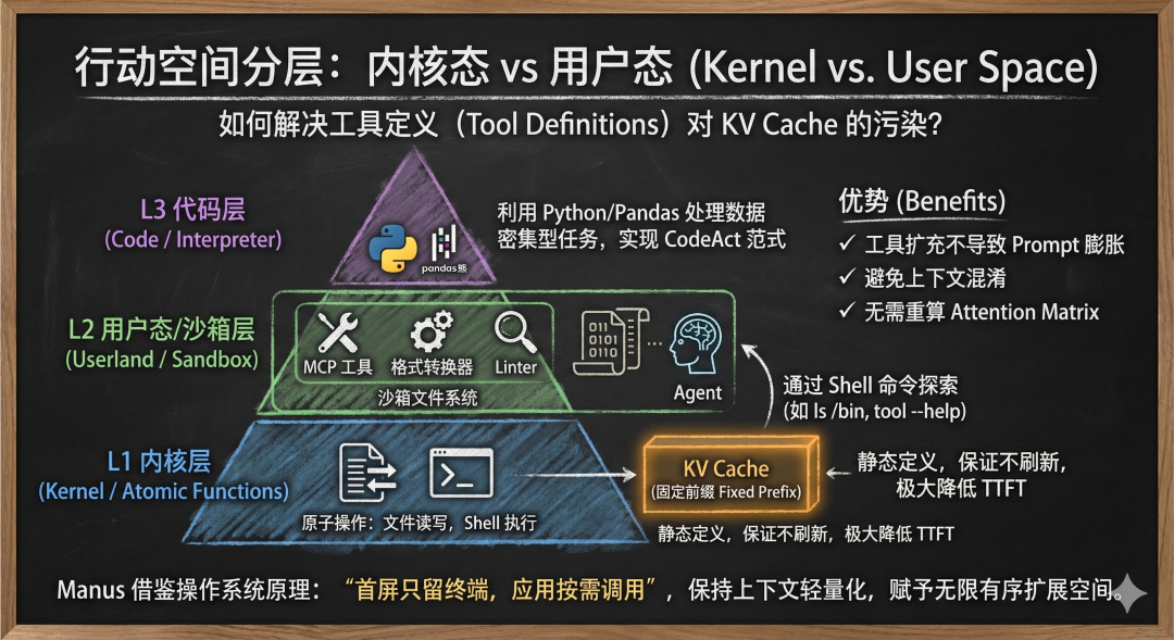 L1 内核层 (Kernel / Atomic Functions):仅保留文件读写、Shell 执行等原子操作。这些定义是静态的,位于 System Prompt,保证 KV Cache 的固定前缀(Fixed Prefix)不被刷新,极大降低 Time-to-First-Token (TTFT) 延迟。