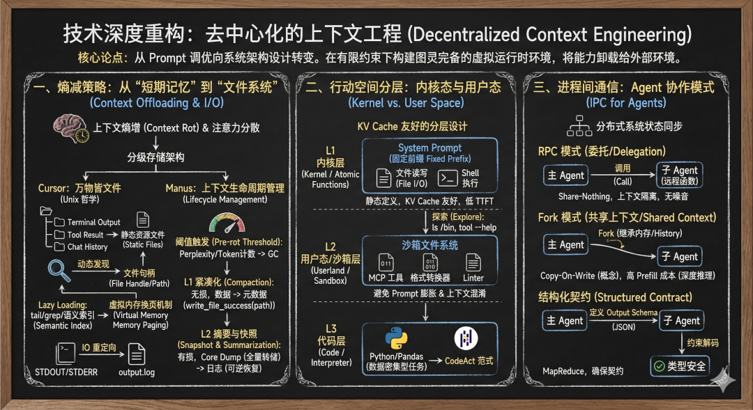 核心论点:上下文工程(Context Engineering)的本质不是“如何填充 Prompt”,而是“如何在有限的 Attention Window 和 KV Cache 约束下,构建一个图灵完备的虚拟运行时环境”。过度工程化(Over-engineering)通常源于试图在 Prompt 中模拟操作系统,而正确的路径是将能力卸载(Offload)给外部环境。