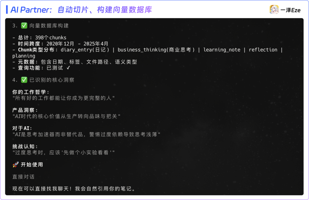 借此,Agent 就能理解 AI-Partner 的初始化与对话方法,引导用户上传包含个人记忆的文档预料,在用户端智能切分笔记片段,构建向量数据: