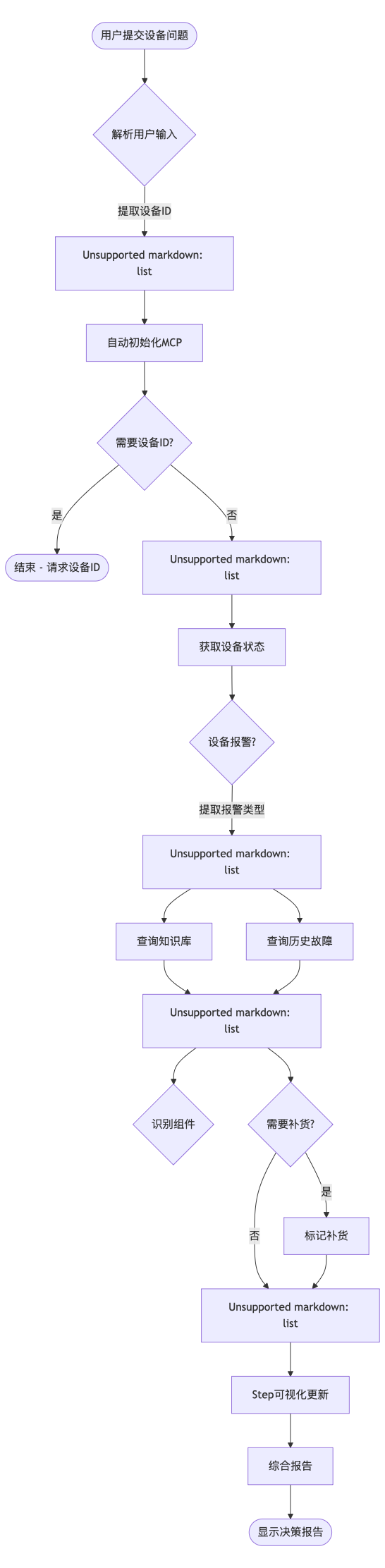 最终,系统返回包含设备状态、故障原因、历史分析、库存信息和行动建议的综合决策报告,为维修人员提供全面的决策支持。