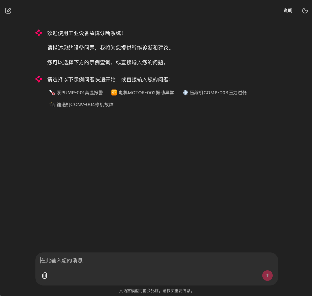 本项目是一个工业设备故障诊断和决策支持系统,旨在解决传统工业设备维护中的痛点问题。系统的核心价值在于将AI技术与工业领域知识深度融合,提供智能化的故障诊断和决策支持。