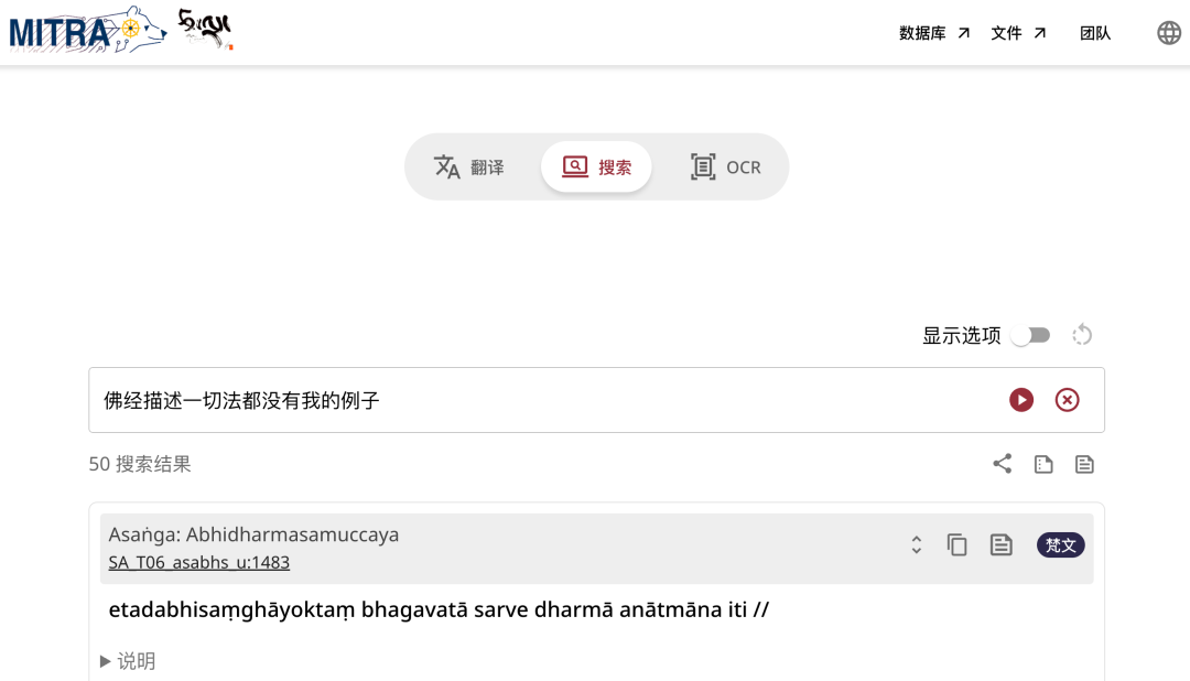 这个工具最开始只是用来进行梵、藏、汉多语种翻译,但是最近他们整合了原来 DharmaNexus 的数据库,于是也可以用来进行检索了。