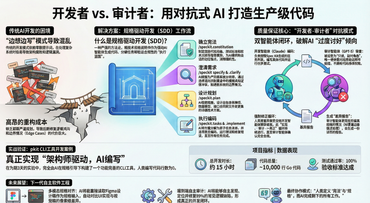 “开发者-审计者”对抗模式的核心价值在于,它通过结构化的流程和不同 AI 模型之间的认知互补,系统性地克服了单一智能体固有的“过度讨好”和“视野局限”等缺陷。它将质量验证从开发流程的末端,前置并融入到每一个实现环节中,形成了自动化的、持续的纠错闭环。
