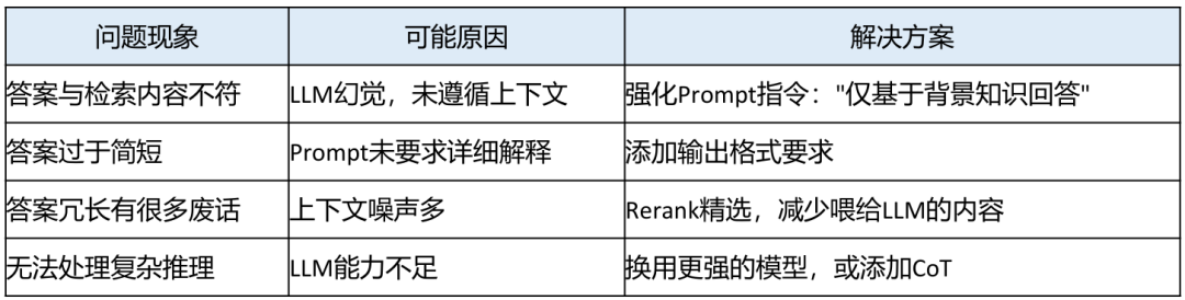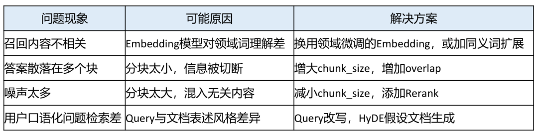- 如果检索结果差,从分块/Embedding/Query改写入手;