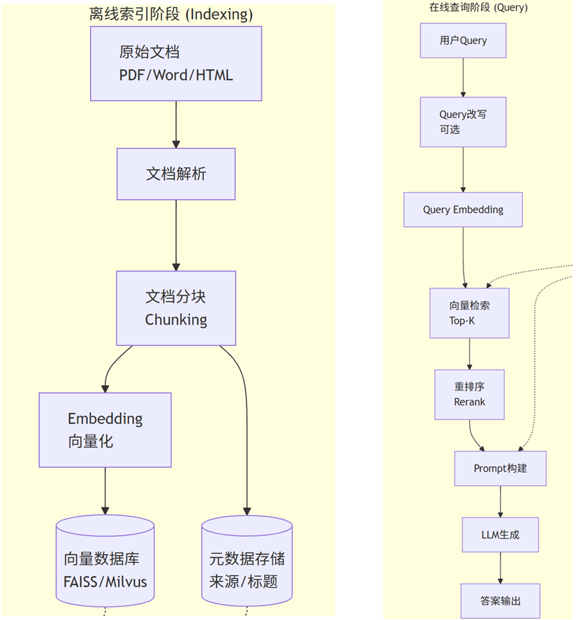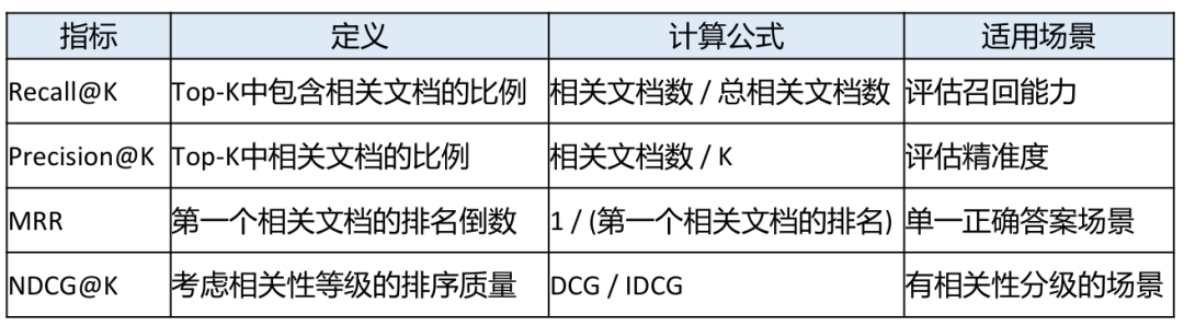 计算Query向量与文档块向量的相似度,返回Top-K结果。距离度量: 余弦相似度、L2距离、内积。