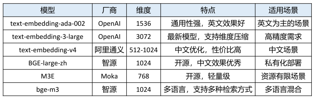 使用Embedding模型将文本块转换为向量。常用模型: text-embedding-v4等。