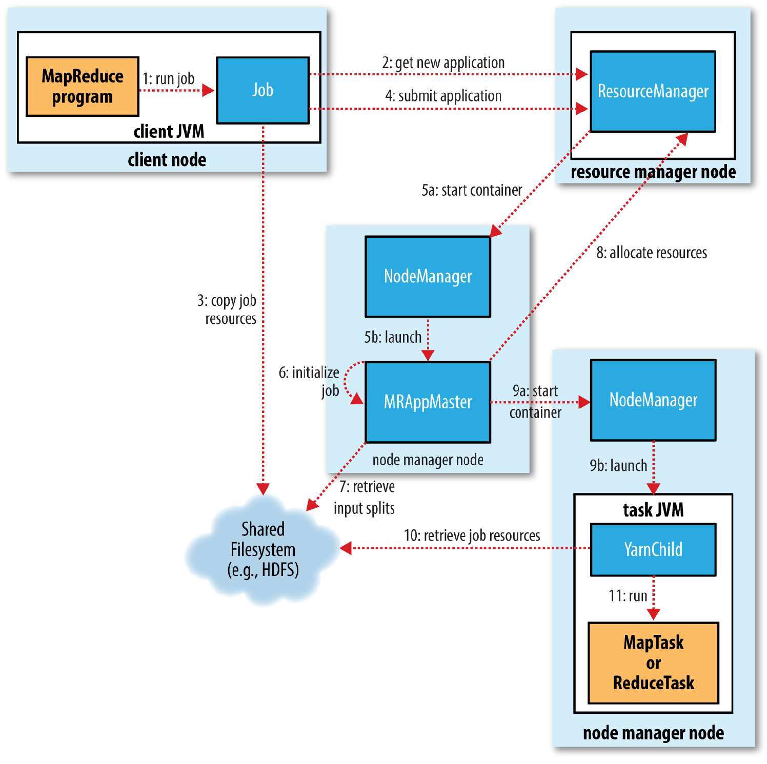 9. Scheduler 分配 Container 后,AppMaster 通知 NodeManager 启动容器。 10. 容器中启动 11. 运行 Map 任务处理分片数据,运行 Reduce 任务汇总 Map 结果。 |