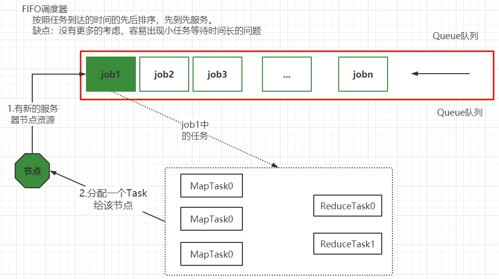 Hadoop最初设计目的是支持大数据批处理作业,如日志挖掘、Web索引等作业,为此,Hadoop仅提供了一个非常简单的调度机制:FIFO,即先来先服务,在该调度机制下,所有作业被统一提交到一个队列中,Hadoop按照提交顺序依次运行这些作业。