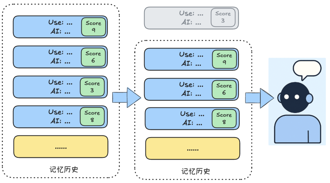评分可以依据多种因素:与当前对话主题的相关程度、最近被提及的频率、信息本身的重要度(例如包含用户关键偏好的句子打高分)等。