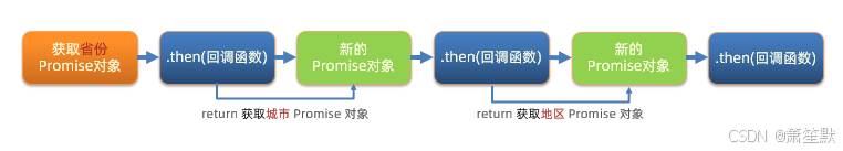 /** * 目标:把回调函数嵌套代码,改成Promise链式调用结构 * 需求:获取默认第一个省,第一个市,第一个地区并展示在下拉菜单中 */ let pname = '' // 1. 得到-获取省份Promise对象 axios({url: 'http://hmajax.itheima.net/api/province'}).then(result => { pname = result.data.list[0] document.querySelector('.province').innerHTML = pname // 2. 得到-获取城市Promise对象 return axios({url: 'http://hmajax.itheima.net/api/city', params: { pname }}) }).then(result => { const cname = result.data.list[0] document.querySelector('.city').innerHTML = cname // 3. 得到-获取地区Promise对象 return axios({url: 'http://hmajax.itheima.net/api/area', params: { pname, cname }}) }).then(result => { console.log(result) const areaName = result.data.list[0] document.querySelector('.area').innerHTML = areaName })