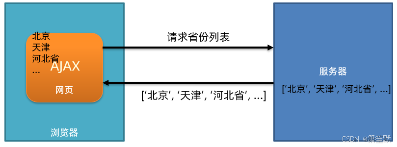 浏览器网页中,使用 AJAX技术(XHR对象)发起获取数据的请求,服务器代码响应准备好的数据给前端,前端拿到数据数组以后,展示到网页