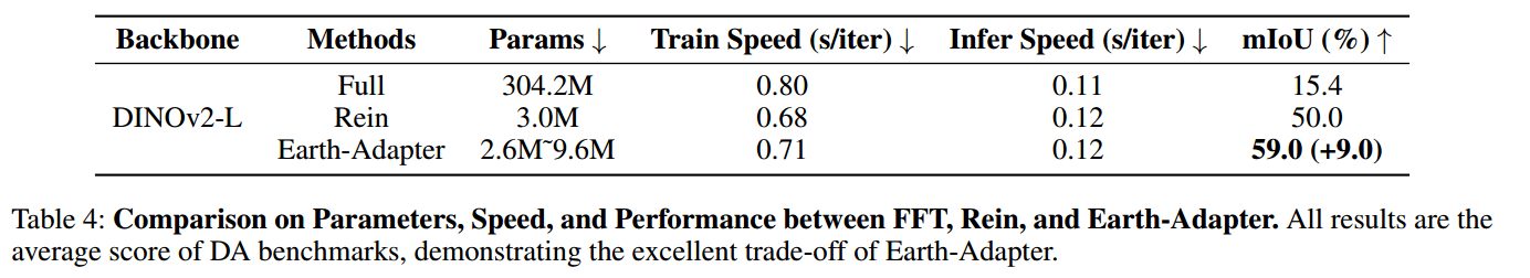 通过比较了FFT,Rein和Earth-Adapter之间的参数,速度和性能,发现在与Rein接近的训练和推理速度的同时,EarthAdapter实现了更好的性能(mIoU提高9.0%),参数范围更小。这进一步证实了Earth-Adapter的效率,这可以归因于其简单而有效的设计方法,使其特别适合于遥感图像的语义分割任务。