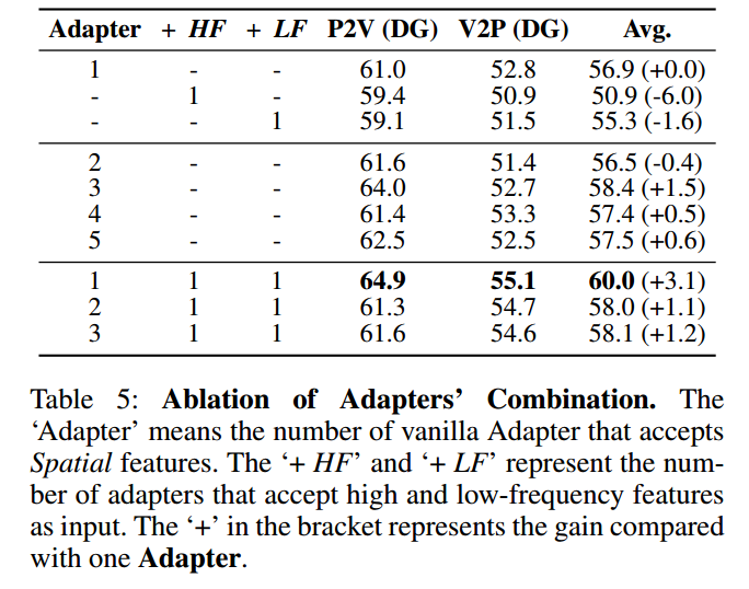 与空间适配器相比,仅使用HF或LF适配器会降低性能,HF会导致更大的下降。这是因为其中HF特征具有更多的伪影和噪声,而LF特征是平滑的,具有清晰的全局语义。因此,仅使用HF严重损害性能,结果为50.9%mIoU,低于空间特征56.9%mIoU。之后,本文还对空间适配器的数量进行了更多的实验,并揭示了最佳组合是一个空间适配器与一个高频和低频适配器。