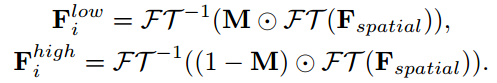 首先将空间特征F整形为(C,H,W),并将DFT应用于空间特征,记为FT(F)。当分裂频域时,我们使用固定的频率截止ρ将频谱分解为高频和低频分量。随后,这些分量通过傅里叶逆变换(IFT)转换回特征,产生LF和HF特征: