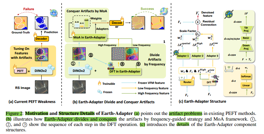 Earth-Adapter引入了一种新的频率引导混合适配器(Frequency-Guided Mixture of Adapters)方法,围绕“分而治之(divide and conquer)”策略构建。