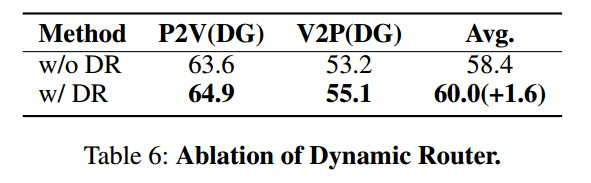 如表6所示,动态路由器的使用带来了更好的结果,在两个DG基准测试中平均提高了1.6%的mIoU。与静态权重(每个静态路由分配1/3的权重)相比,动态路由器可以自适应地调整特征分配权重,从而实现更有效的表示优化。
