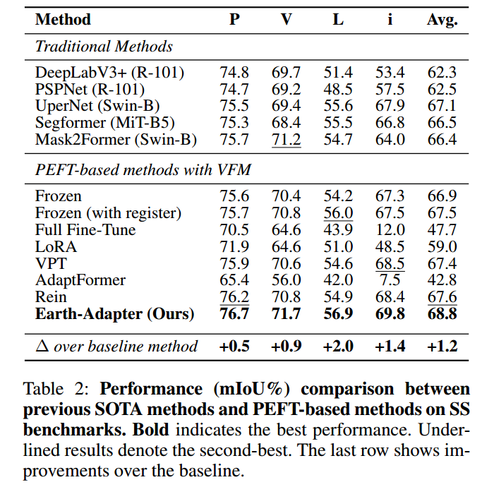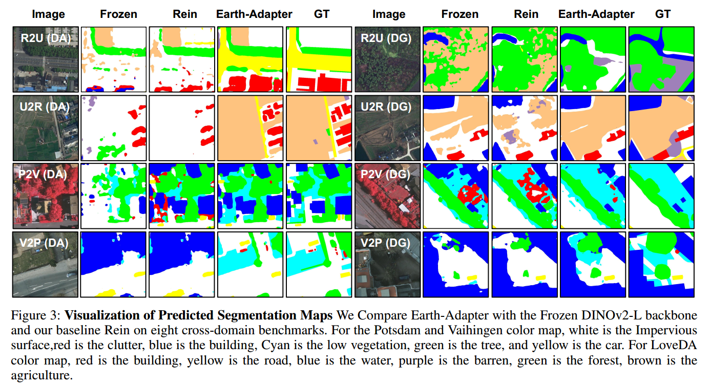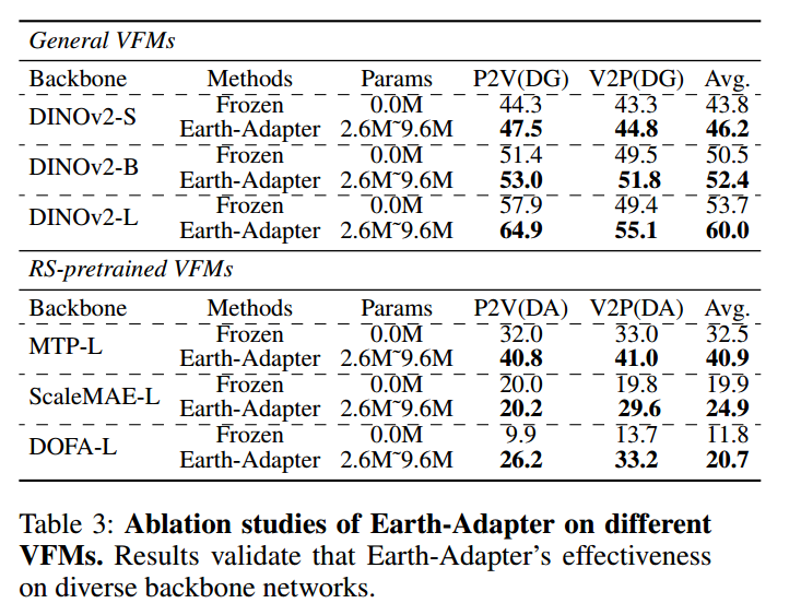 除了表1和表2中使用的DINOv2-Large主干之外,还进一步评估了其他DINOv2变体。ViT-Small和ViT-Base的结果(表3,第3-8行)。表明Earth-Adapter在不同尺度的主干上持续提高性能。