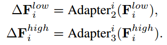 其中Fi表示来自backbone的第i层的视觉特征,Adapter1表示由两个低秩矩阵和激活函数组成的非线性映射层: