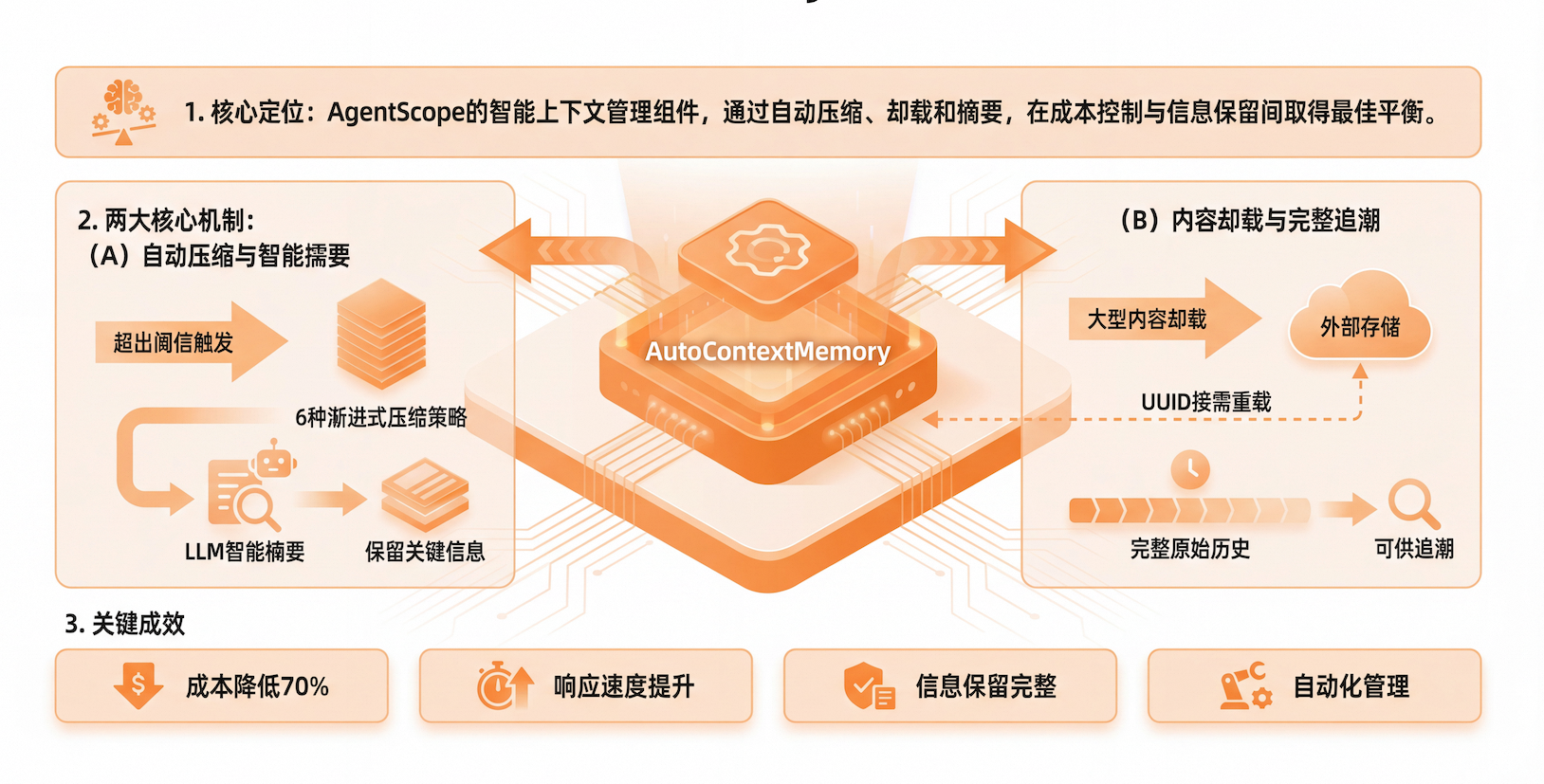 AgentScope推出的AutoContextMemory组件解决了智能Agent在长对话场景中面临的成本激增、性能下降等问题。该组件通过自动压缩、卸载和摘要对话历史,提供6种渐进式压缩策略,在保留关键信息的同时降低70%的API调用成本。采用多存储架构确保信息可追溯,支持跨会话持久化。实测显示,在代码分析等长对话场景中能显著提升响应速度并控制成本。
