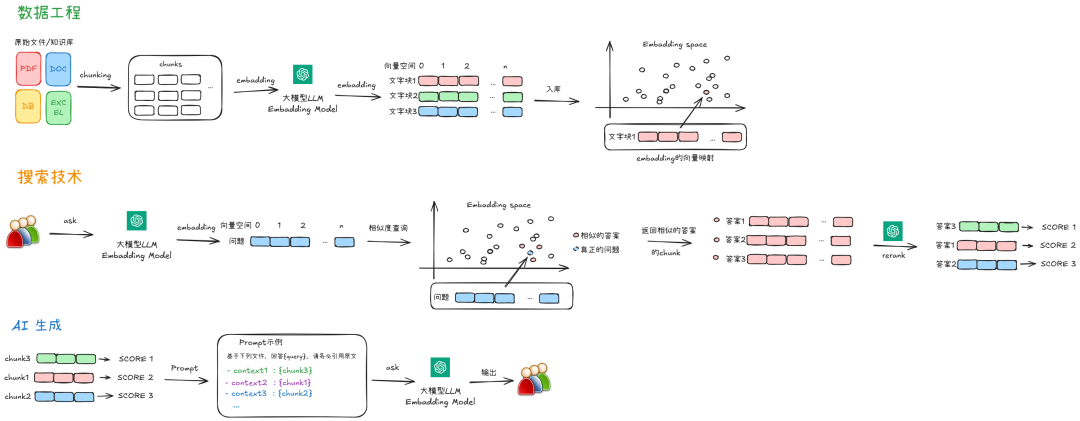 PS:1.切块策略(固定大小、语义分割)策略很多,是 RAG 效果好坏的第一道生死线,之后会详细写一篇文章说明。2.数据清洗是也是工程中极具挑战性的问题,甚至是最费时间的,比切块还麻烦。本文优先介绍RAG。