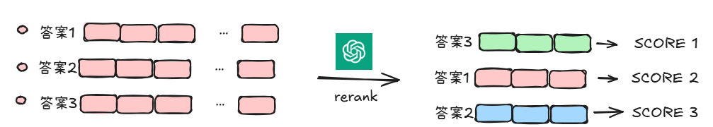 Rerank 通过 **“粗排 + 精排”** 的两阶段策略,在速度和精度之间找到了平衡:根据Rerank模型计算出的精准分数,对文档重新进行排序,最后截取分数最高的 Top N(例如Top 5)投喂给大模型。