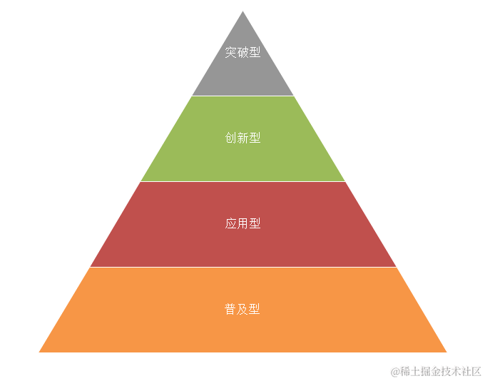 这四类AI产品经理分布如下所示,呈金字塔分布,突破型AI产品经理少之又少,但这是整个社会进步的先锋队,做这类工作要有耐心,不能玻璃心,禁得起失败的打击。