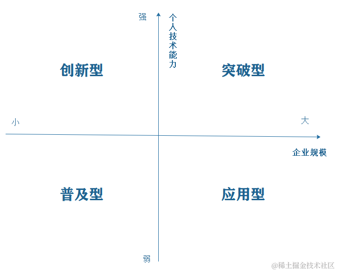 而根据企业大小和个人技术能力的不同,AI产品经理可分为四个象限。