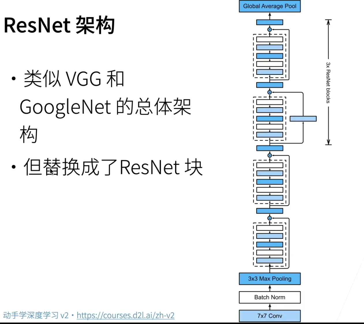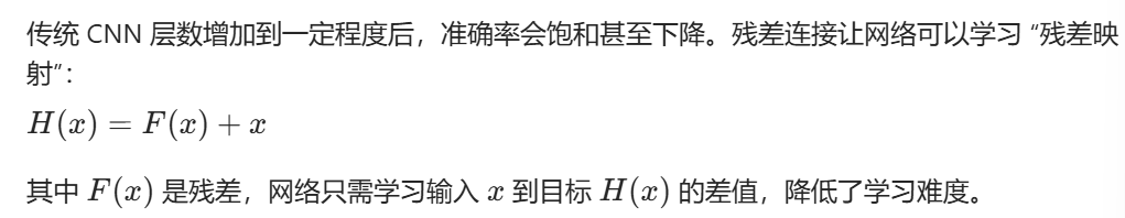 虚线连接:输入与输出通道数不同时,用 1×1 卷积调整通道数和尺寸,实现维度对齐