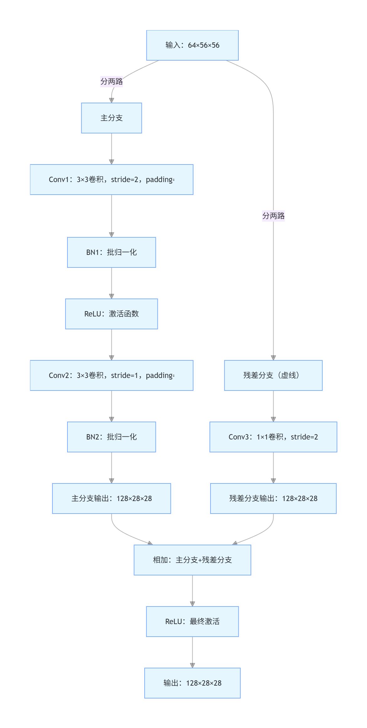 当输入与输出通道数不同时(如layer2的第一个残差块),残差分支用 1×1 卷积对齐维度: