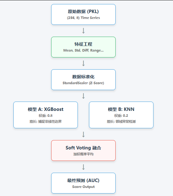 StandardScaler后,模型融合效果提升了显著的百分点。 - 融合的艺术:XGBoost 关注“切分”,KNN 关注“距离”。两者的错误模式不同,融合后能有效降低方差,提升 AUC。