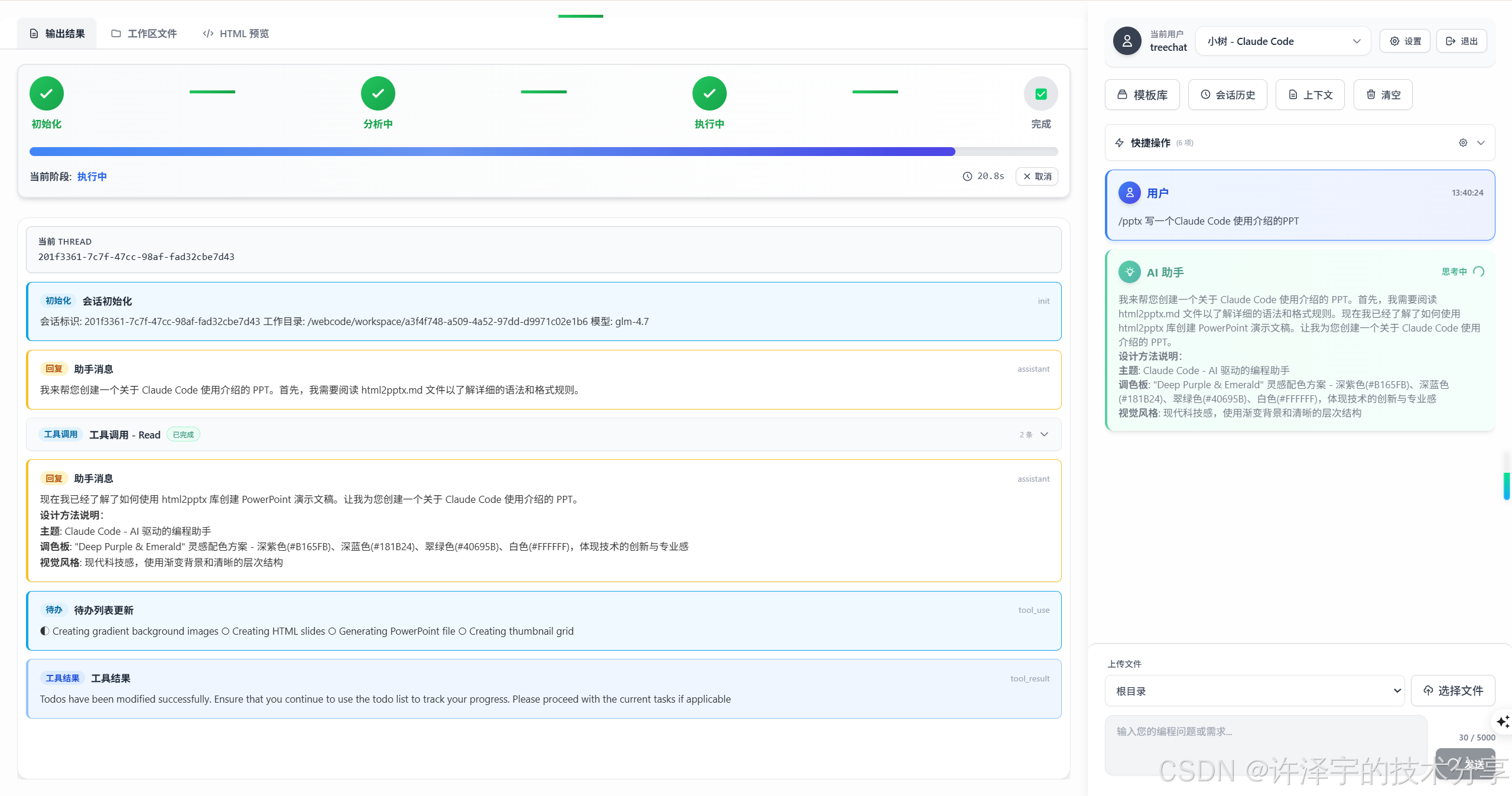 AI 的思考过程、工具调用、代码生成……所有内容都实时流式展示,就像看 AI 在屏幕上"打字"一样。不用干等,随时能看到进度。