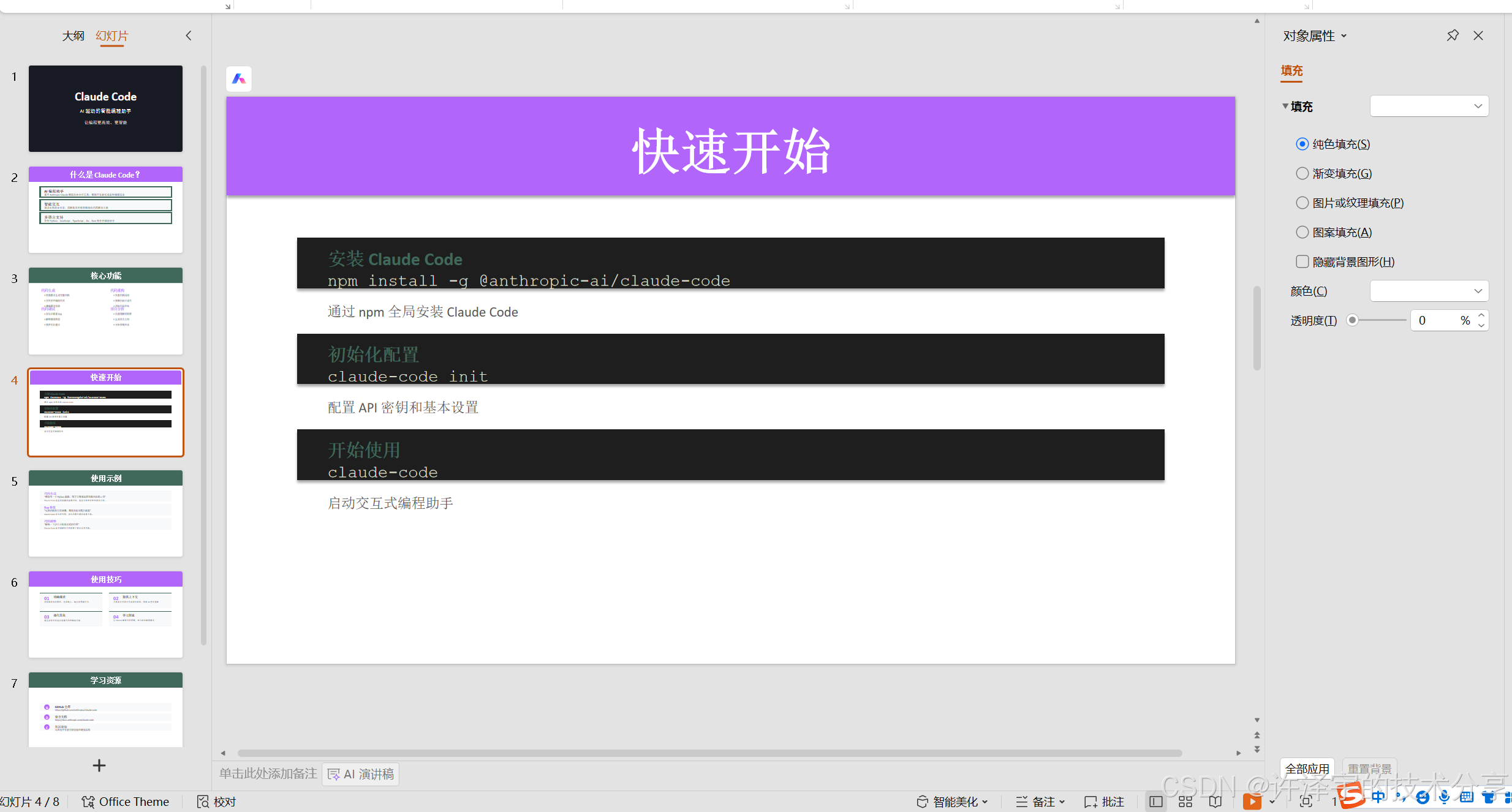 AI 自动创建演示文稿、设计布局、填充内容。我只需要最后过一遍调整细节。