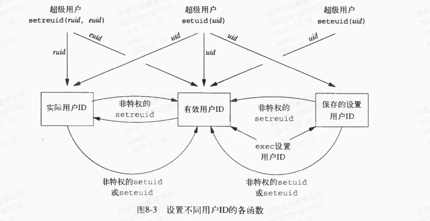 (1)若进程具有超级用户特权,则setuid函数将实际用户ID、有效用户ID、以及保存的设置用户ID设置为uid