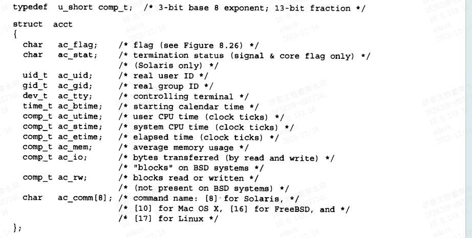 accton命令调用acct函数启动进程会计,将会计记录写入特定的路径,linux中,会计记录写入/var/account/pacct,会计记录的形式如下: