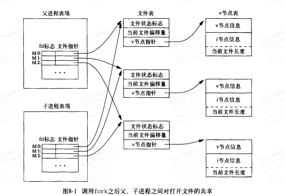 这种共享方式使得父子进程对同一文件使用了一个文件偏移量。如果父、子进程写道同一文件描述符,但又没有任何形式的同步,那么他们的输出就会混合。考虑之前的例子,假如我们在终端输入如下命令:./a.out >temp.out将标准输出重定向到temp.txt文件中,fork之后,父进程和子进程分别调用了一次printf,如果父进程没有sleep两秒等待子进程printf完成,那么父进程和子进程的输出很可能会混在一起。