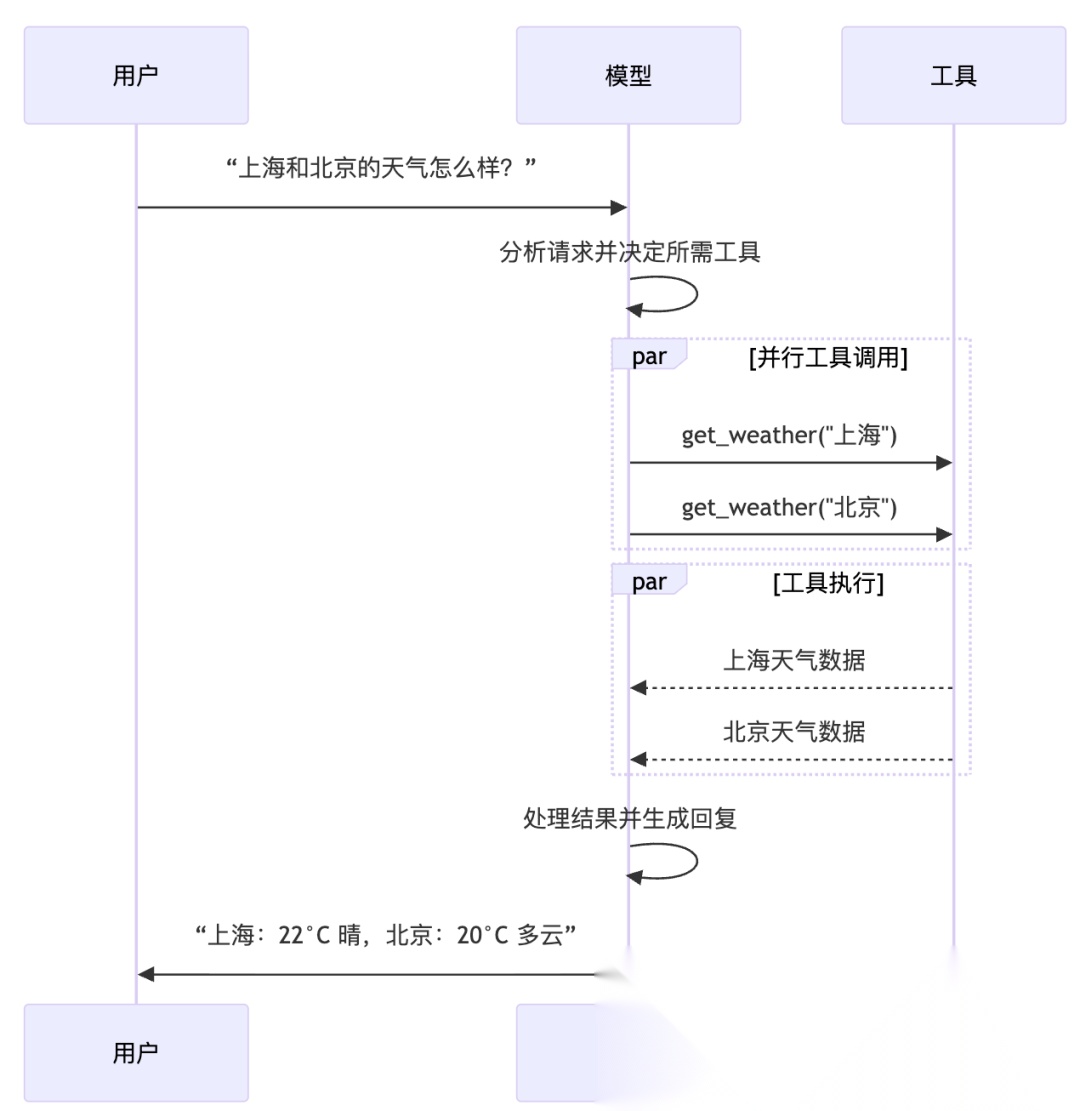 这在需要同时调用多个工具时非常有用,例如同时获取多个城市的天气。